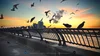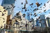 11:07 AM, February 6, 2016Hell's Kitchen, NYCA "locust" of pigeons doing a flyby about to descend on a mound of freshly laid out breadcrumb in an empty parking lot in Hell's Kitchen.